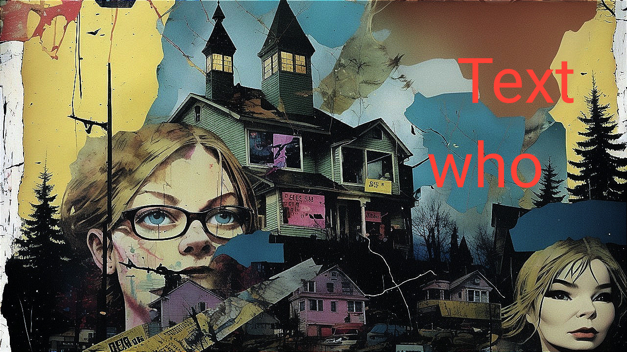 A woman with striking makeup stands in front of a vintage, haunted-looking house. The background features colorful, abstract designs and silhouettes of birds, creating a surreal, eerie atmosphere.