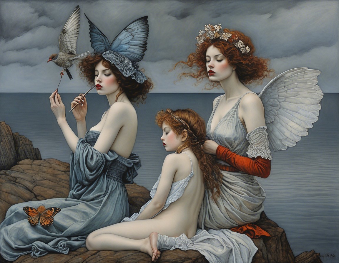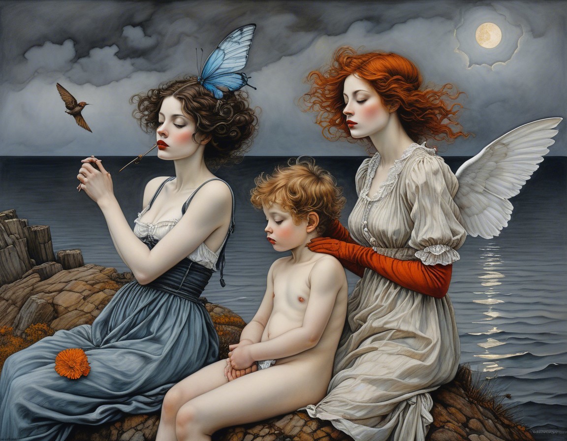 The artwork features three women by the shore, surrounded by dark, swirling clouds and a glowing moon. Their styled hair and vintage clothing contrast with the turbulent sea, evoking deep emotion.