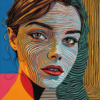 This vibrant portrait features a woman with striking green eyes and bold lips, surrounded by colorful, swirling lines and patterns that create a dynamic and modern aesthetic.