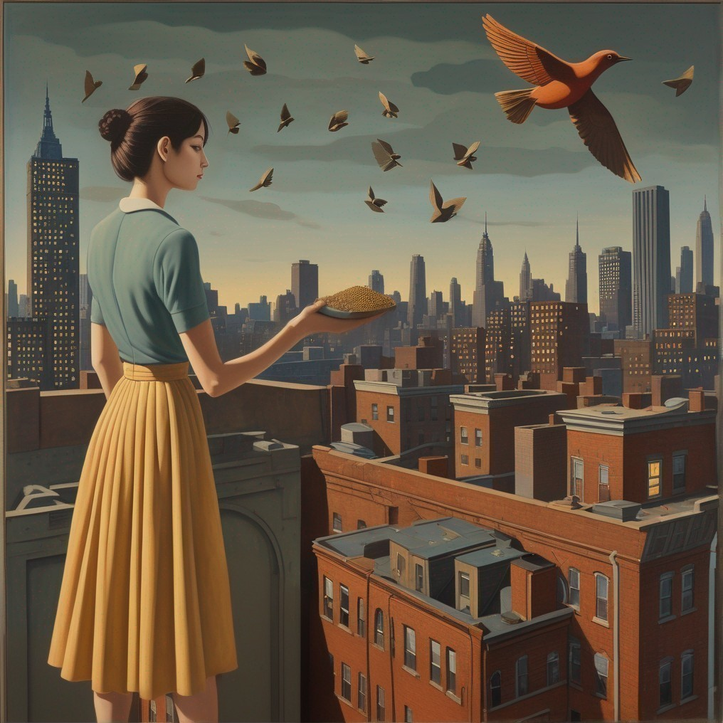 A woman on a rooftop feeds birds over a cityscape with skyscrapers under a clear sky.