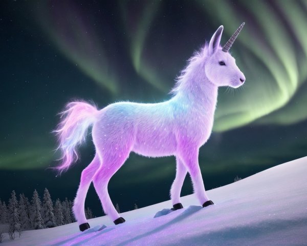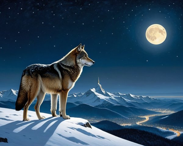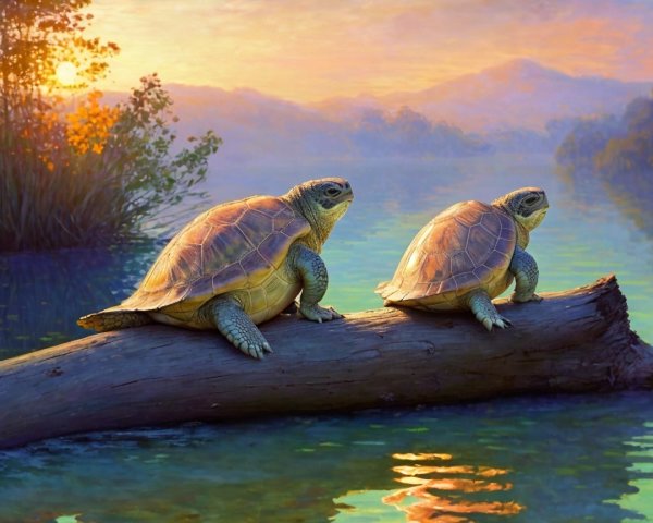 A serene scene depicts a white fox sitting on a rock by a calm lake, reflecting the majestic mountains and a soft pastel sky at dawn. The tranquil atmosphere conveys peace and beauty in nature.