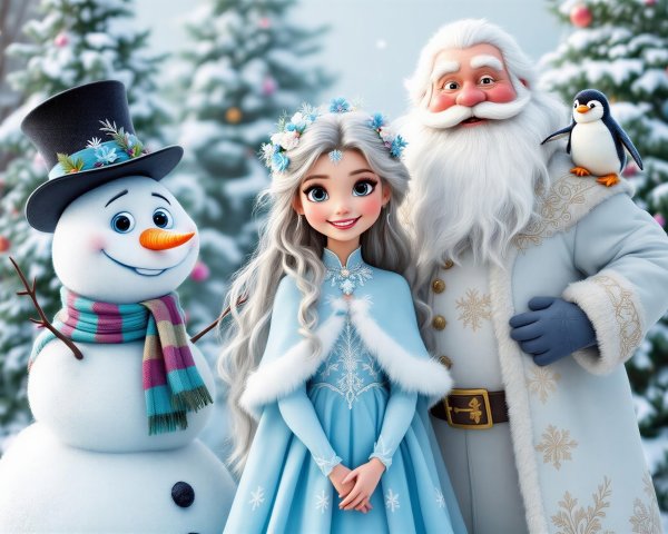 In a vibrant forest, a captivating princess with flowing red hair and green eyes embodies nature's beauty, surrounded by colorful butterflies and birds, alongside a noble forest king.