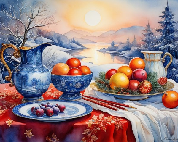 A tranquil scene features a calm lake reflecting fog-covered mountains and a solitary tree. Soft shades of blue and gray create an ethereal, peaceful atmosphere under a cloudy sky.