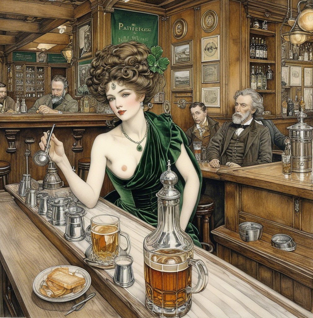A woman in a stylish green dress and top hat sits at a bar, surrounded by men in formal attire. She writes on a notepad, with beer glasses lined up in front of her, capturing a vibrant scene.