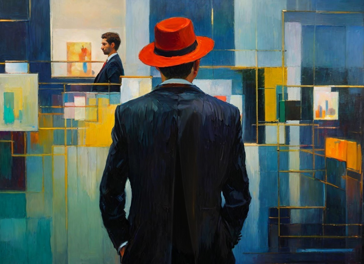 A painting of a man in a red hat observing another man looking at an artwork, surrounded by abstract shapes, signed by John Barry.