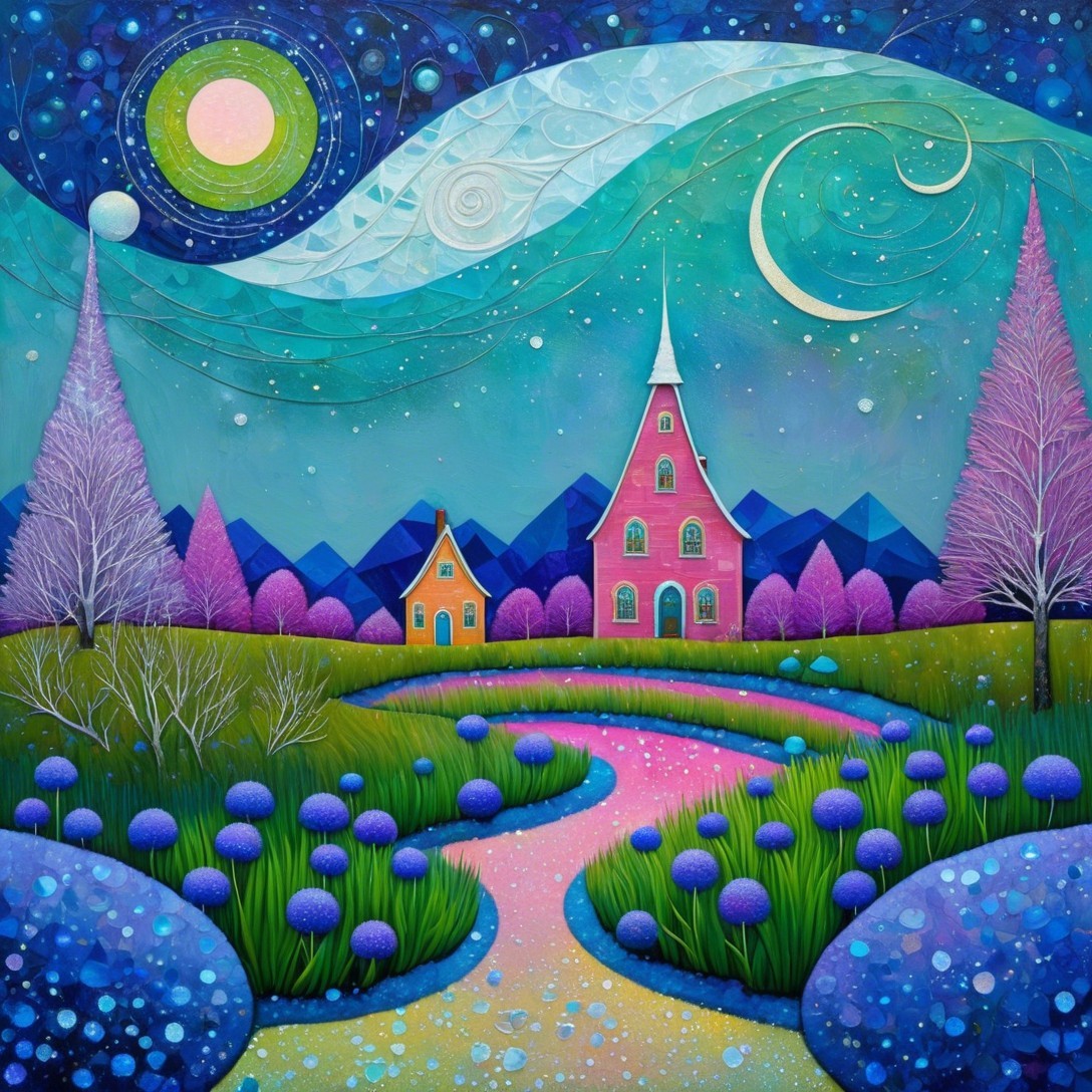 A dreamlike, highly detailed, vibrant, and intricate painting of a whimsical landscape at night with two stylized houses. The foreground features a winding river with light orange, pink, and yellow reflections, flowing through a lush green field filled with numerous round, blue and purple globe-like flowers. Large,