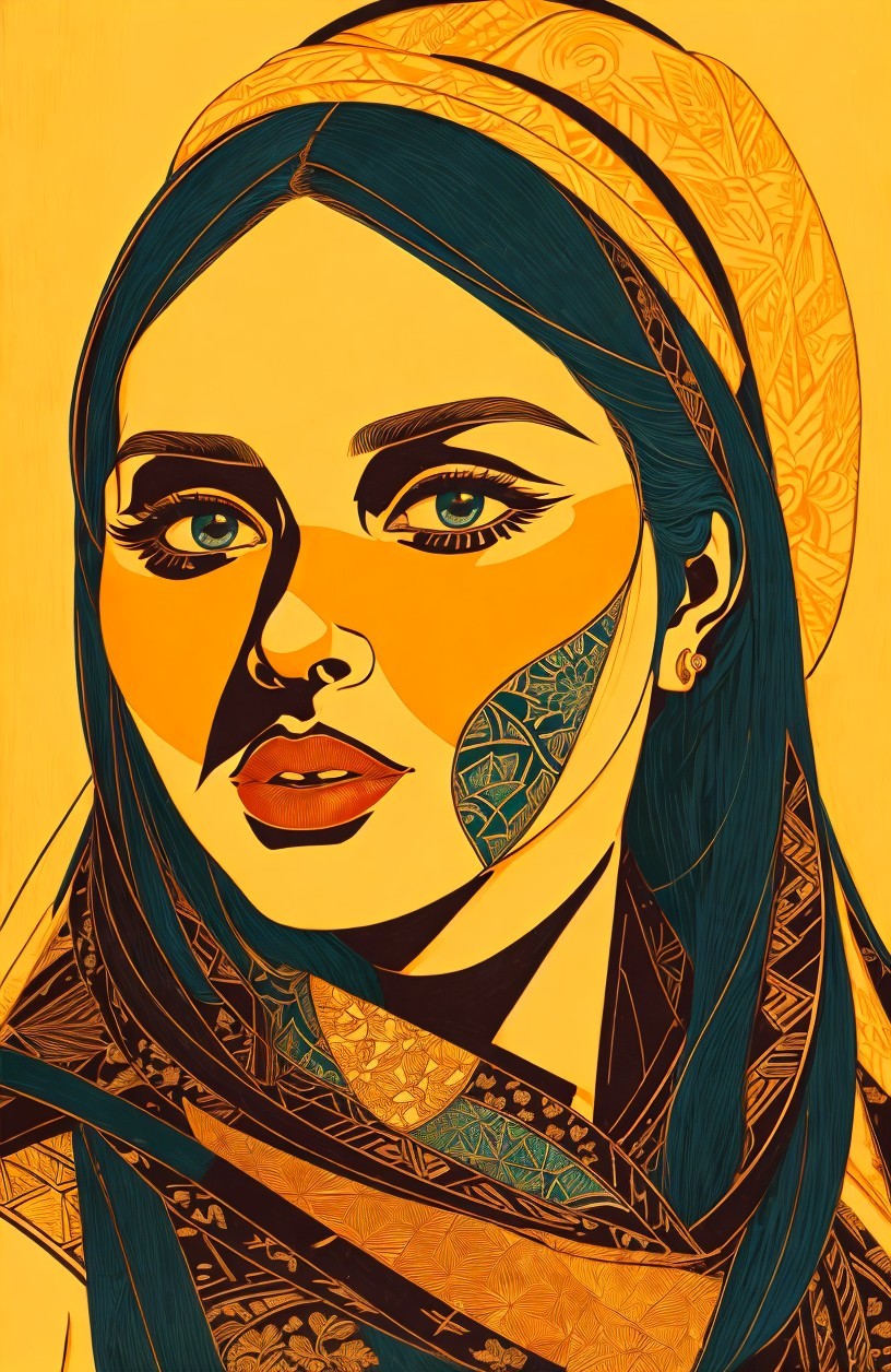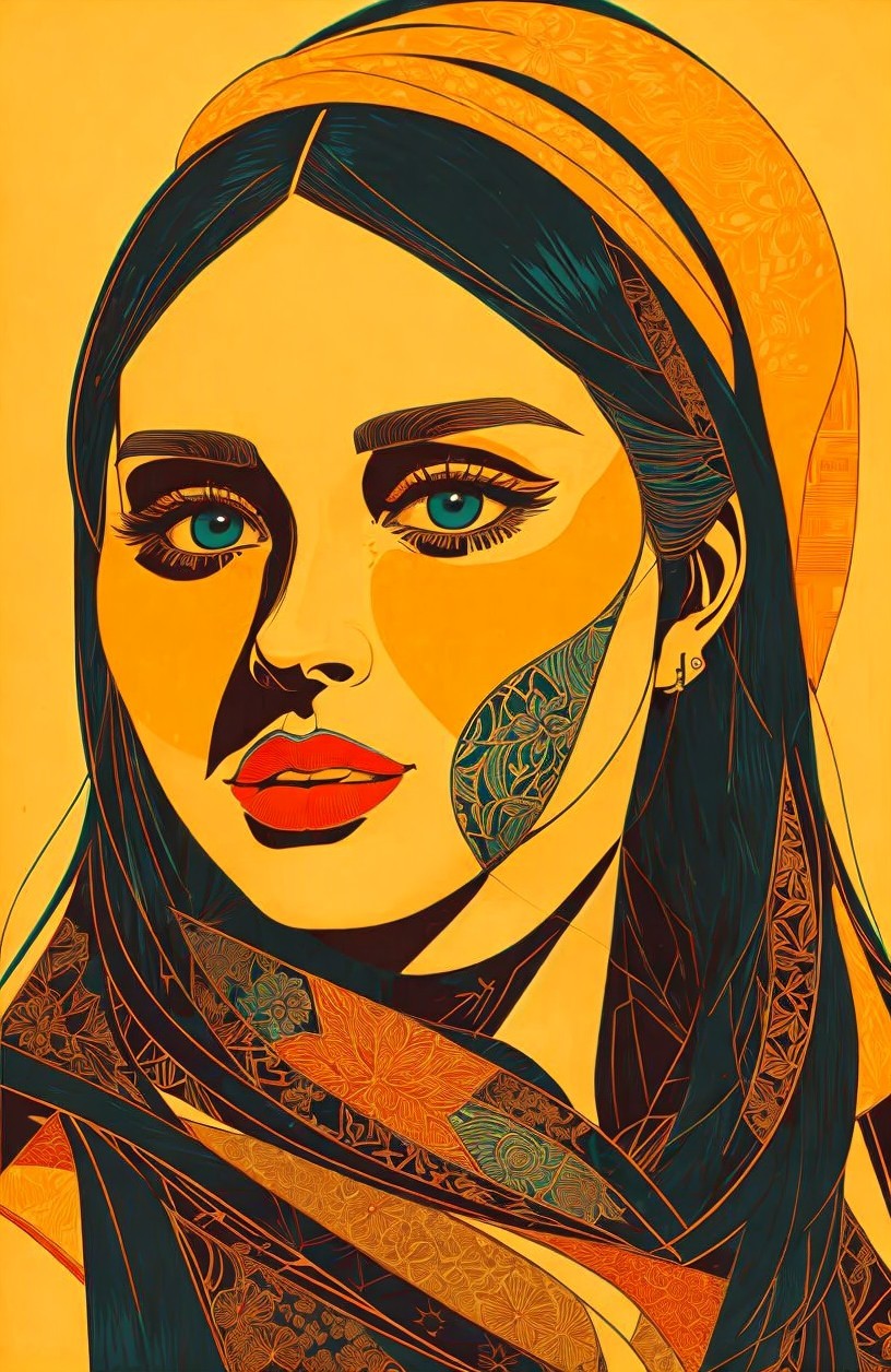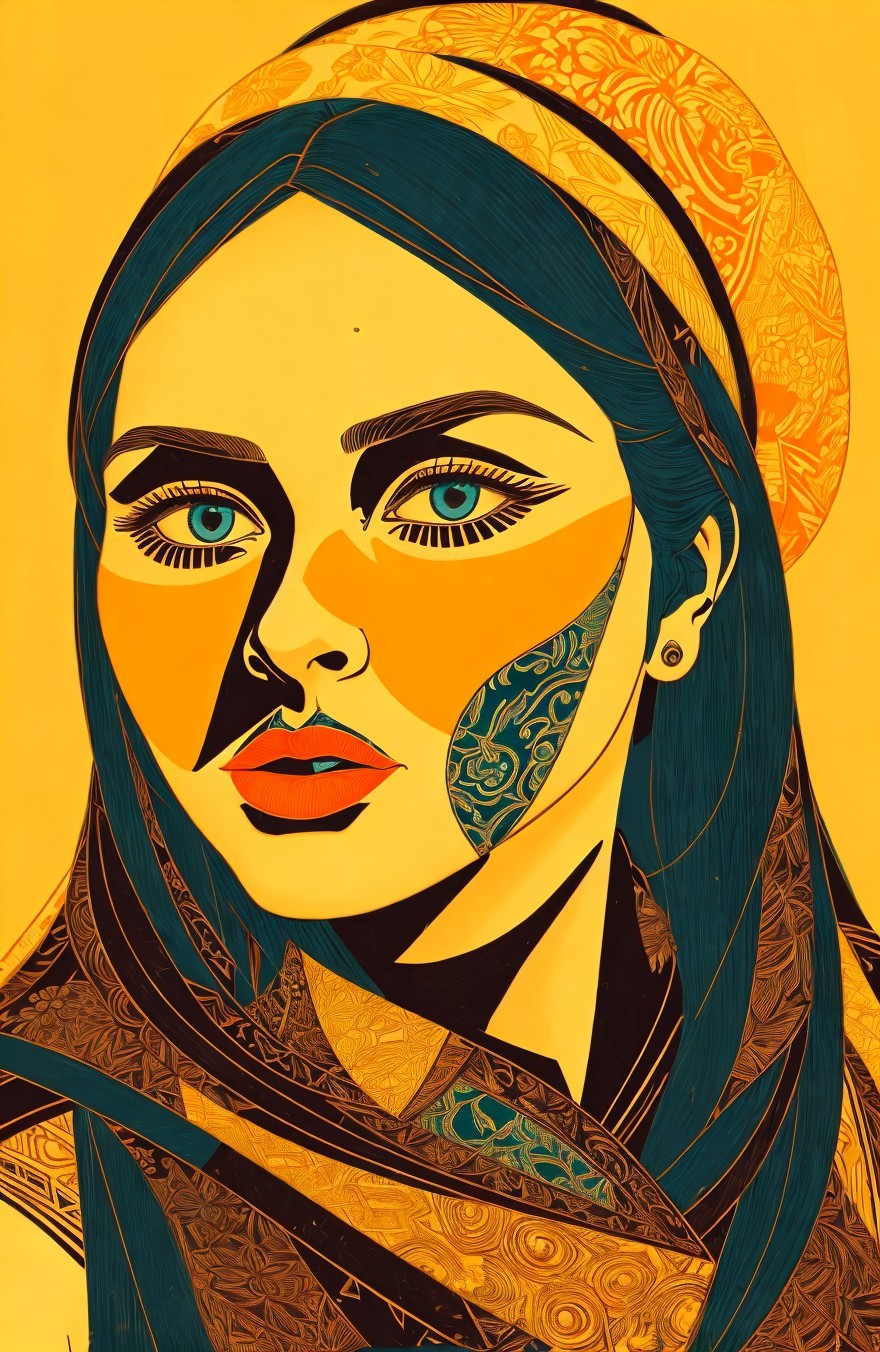 Stylized Portraiture, woodblock print, very dark teal lines, upper body in stylized lineage, lineage maximalism, handsome eyes and detailed nose, perfect handsface, cel-shaded, somber, sore, strict, celestial, alcohol ink, illuminated, enchanting, ephemeral, spectacular, dreamy, etheral, otherworldlines, sstyle of Amanda Clark, Margaret Keane, Overton Loyd, William timlin, Arlie Opal, Florianne Becker, humid, radiance, highly detailed strokes, stacked lines, triadic color scheme gold teal orange, luminosity 1.3, devilish eyes 1.7, fauvistic cuts, tints of movie poster art, intricate ornamental lineage, detailed background with pattern, intricate fantasy art, highly chipped peeling, lineage textures, stylized illustration, fine detailed strokes, coherent, fauvistic, synthetic, spiritual essence, encaustic strokes, gorgeous zentangle surrounding, Creamy illustrative lines, highlighted reflections, vibrant strokes, high coloring 1.9, anisotropic filtering 1.7, colorful yam, detailed ornamental lineage, ambient occlusion 1.5, custom_loss: grey, divine, gorgeous plasticity 1.6, radiance, illustrative maximalism, very stylized illustration 1.8, tints of art nouveau, raytraced shadows 1.8, beautiful composition 1.9, coffinwood 1.7