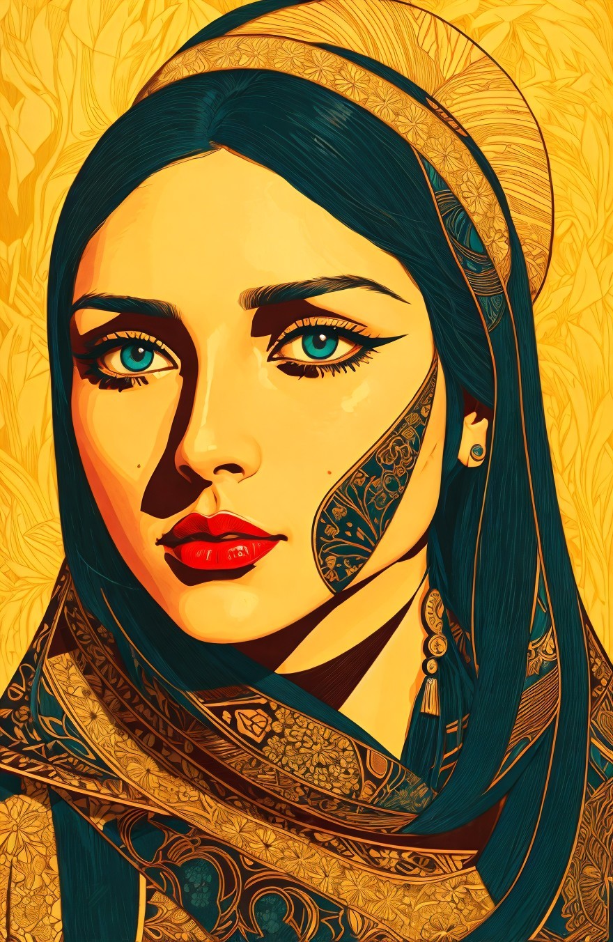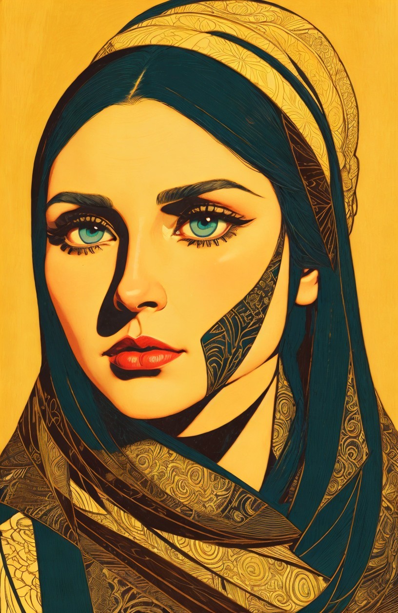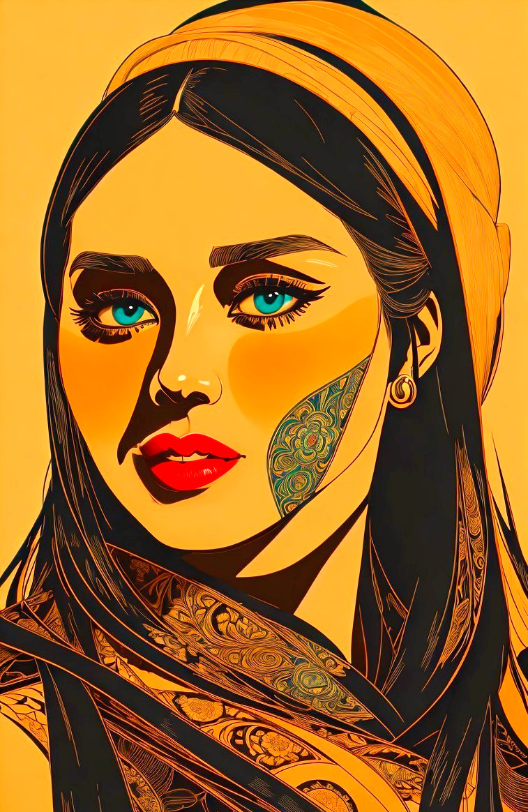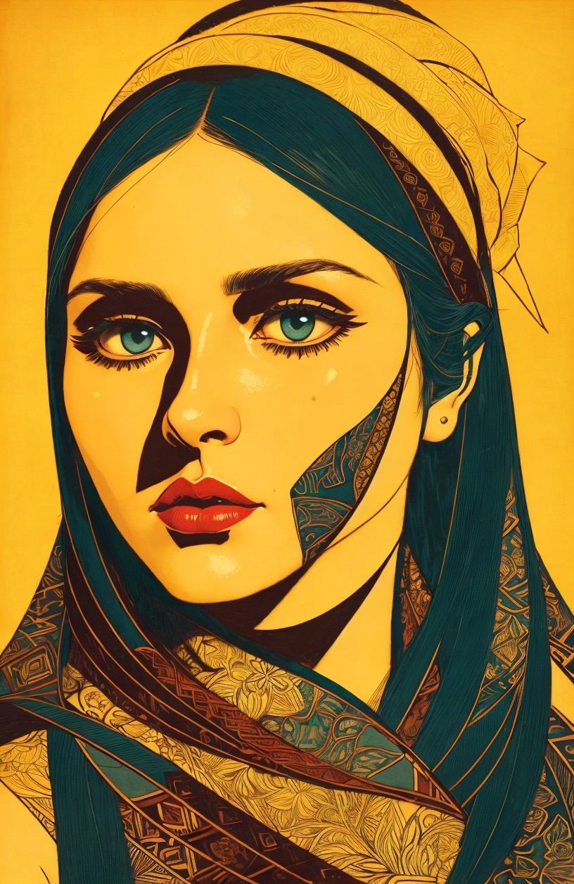 Stylized Portraiture, woodblock print, very dark teal lines, upper body in stylized lineage, lineage maximalism, handsome eyes and detailed nose, perfect handsface, cel-shaded, somber, sore, strict, celestial, alcohol ink, illuminated, enchanting, ephemeral, spectacular, dreamy, etheral, otherworldlines, sstyle of Amanda Clark, Margaret Keane, Overton Loyd, William timlin, Arlie Opal, Florianne Becker, humid, radiance, highly detailed strokes, stacked lines, triadic color scheme gold teal orange, luminosity 1.3, devilish eyes 1.7, fauvistic cuts, tints of movie poster art, intricate ornamental lineage, detailed background with pattern, intricate fantasy art, highly chipped peeling, lineage textures, stylized illustration, fine detailed strokes, coherent, fauvistic, synthetic, spiritual essence, encaustic strokes, gorgeous zentangle surrounding, Creamy illustrative lines, highlighted reflections, vibrant strokes, high coloring 1.9, anisotropic filtering 1.7, colorful yam, detailed ornamental lineage, ambient occlusion 1.5, custom_loss: grey, divine, gorgeous plasticity 1.6, radiance, illustrative maximalism, very stylized illustration 1.8, tints of art nouveau, raytraced shadows 1.8, beautiful composition 1.9, coffinwood 1.7