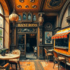 A warm, atmospheric interior features a vintage bar console, elegant furnishings, and large windows casting soft light. A figure stands in the doorway, adding a touch of mystery to the scene.