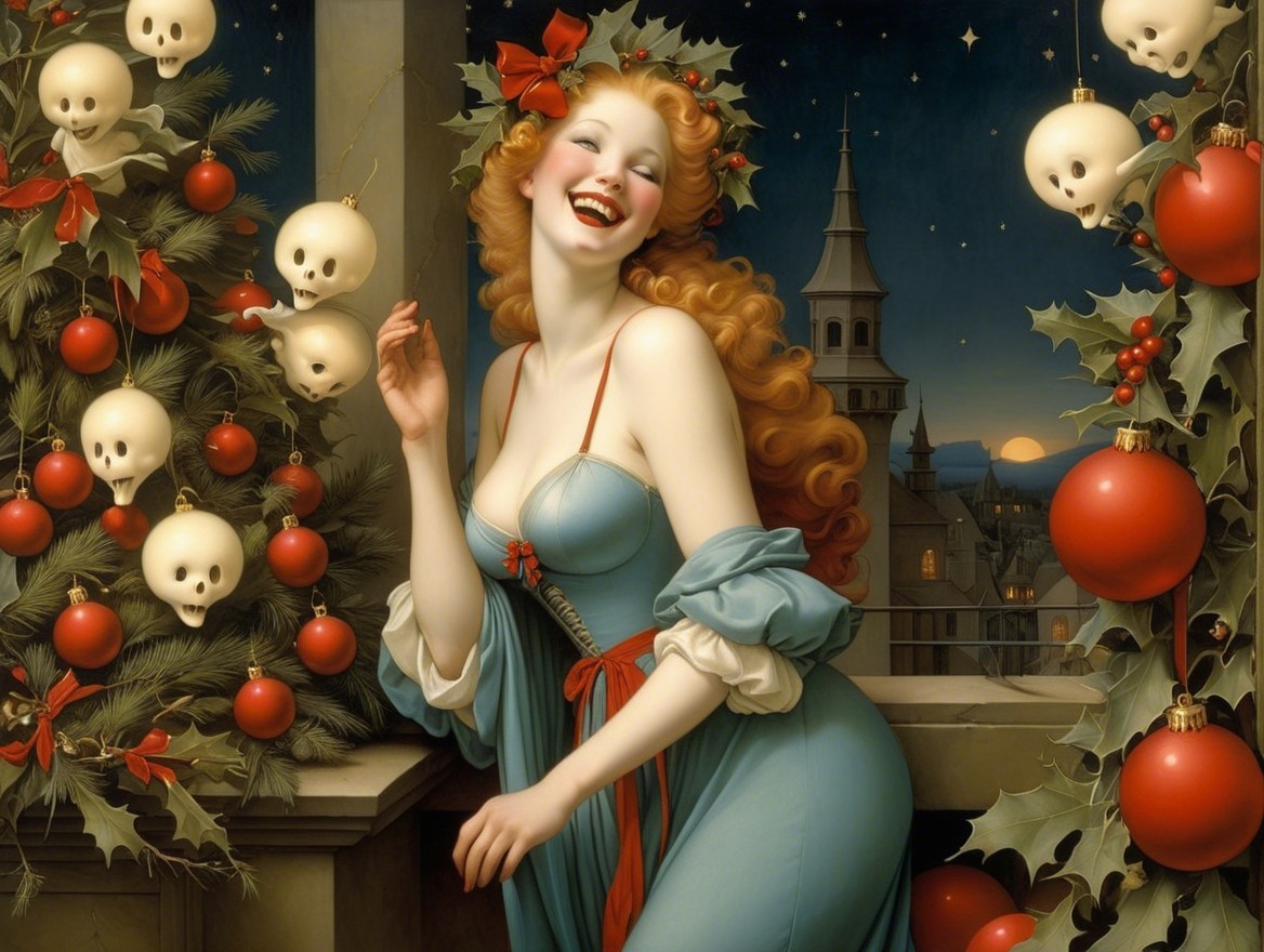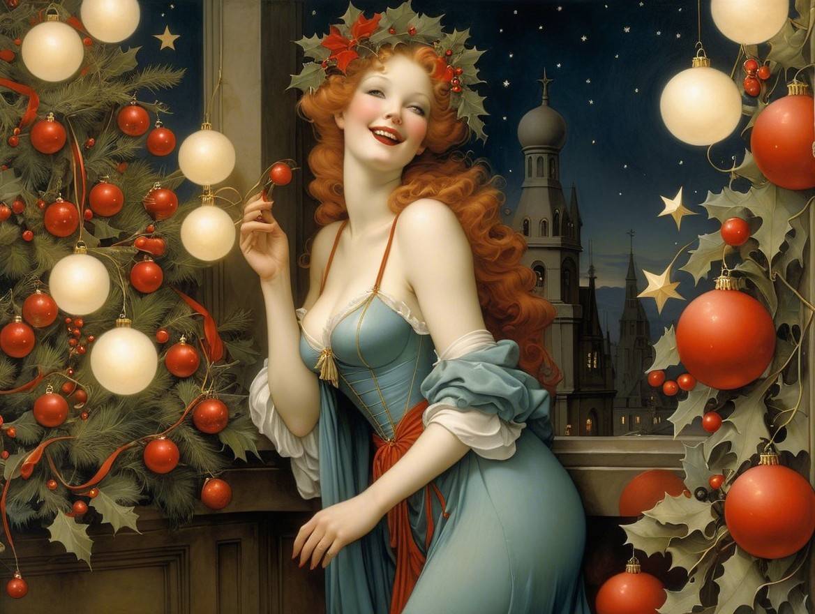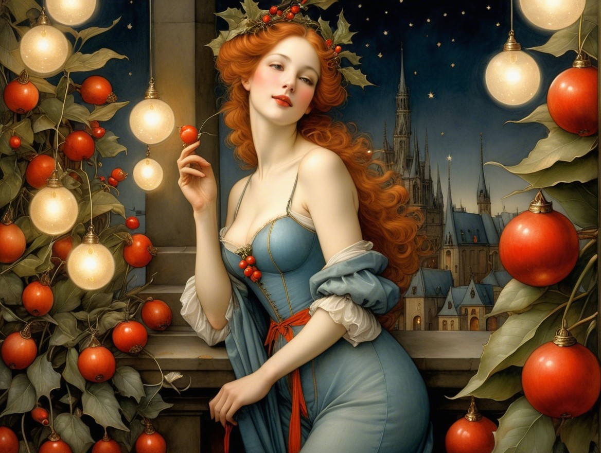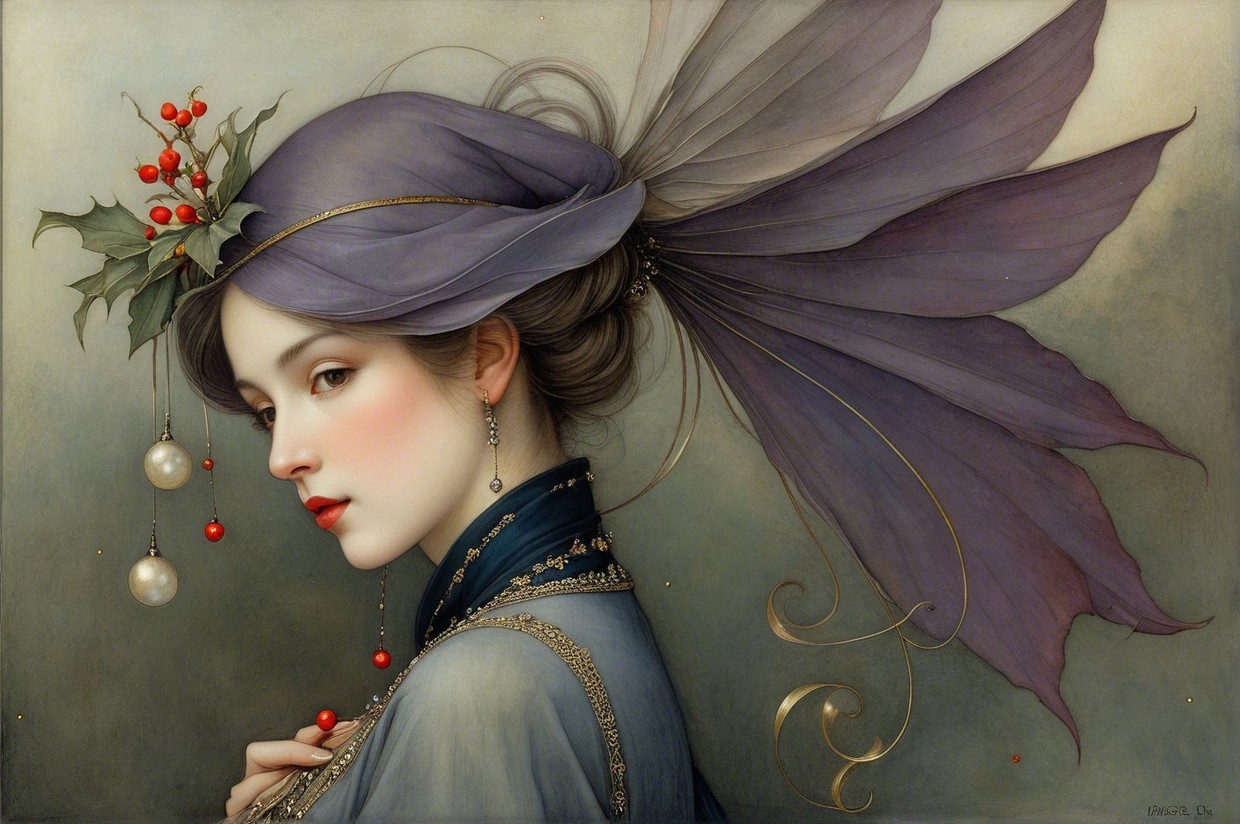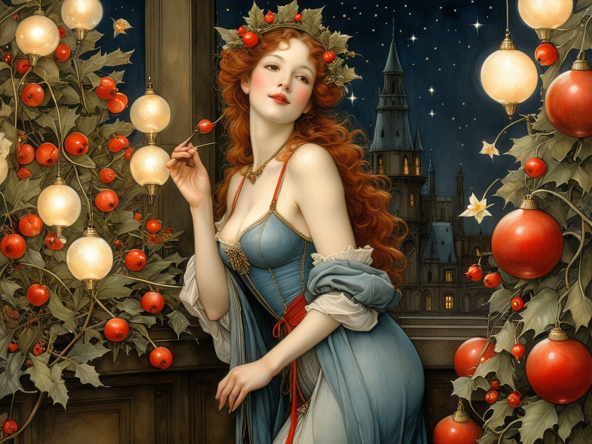 0A graceful woman with flowing dark hair adorned with holly and berries, wearing a blue garment. She gazes softly, surrounded by whimsical lighting and a starry background, exuding a serene charm.