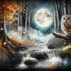 A night scene, a majestic owl sits on a branch, surrounded by a misty forest, a gentle stream, and a glowing full moon illuminating the autumn leaves.