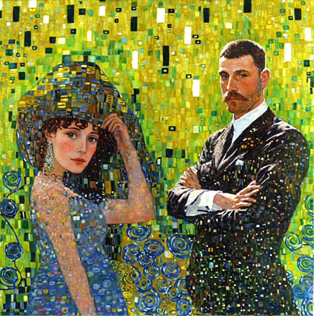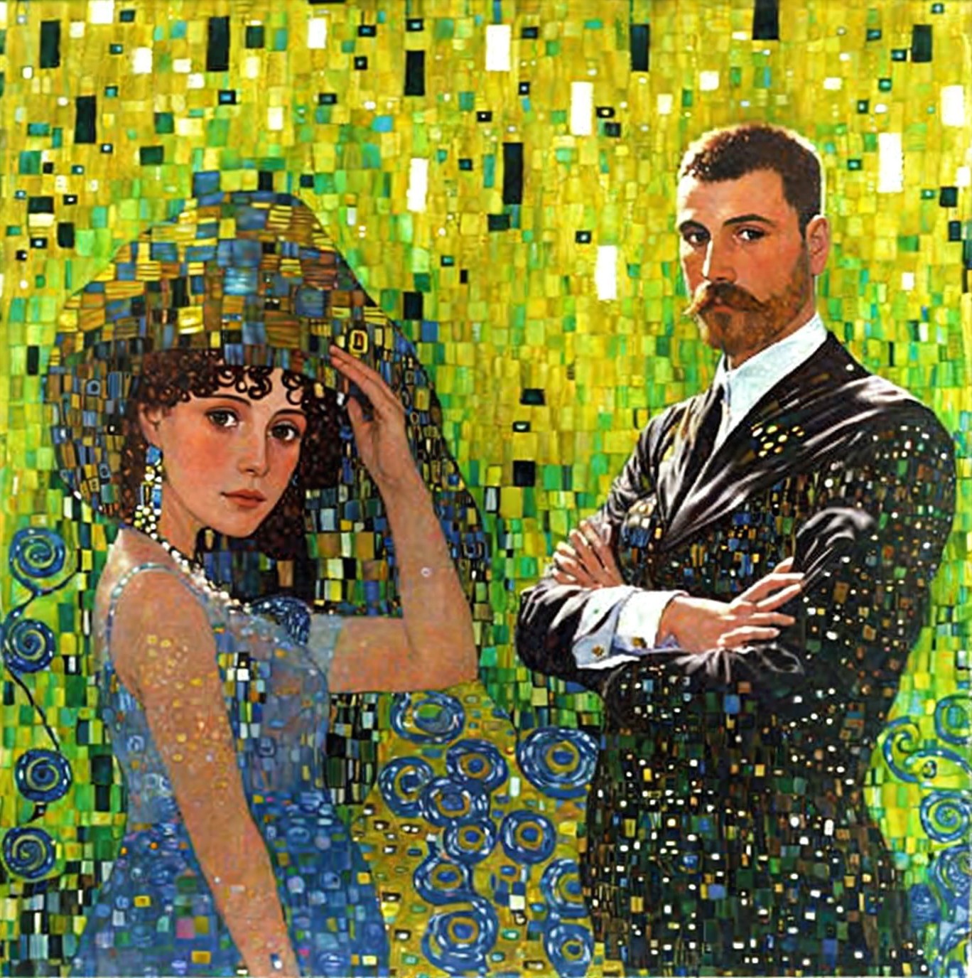 A painting of a couple with a man standing arms folded and a woman seated in a blue dress, both adorned with mosaic patterns.