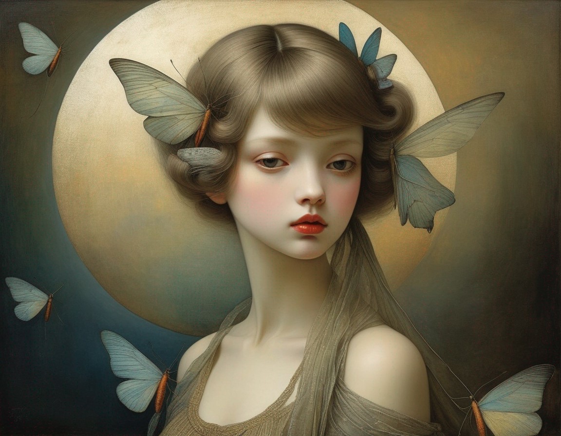 A surreal portrait of a woman with an ethereal aura, adorned with a halo and a translucent veil, exuding a mystic vibe.