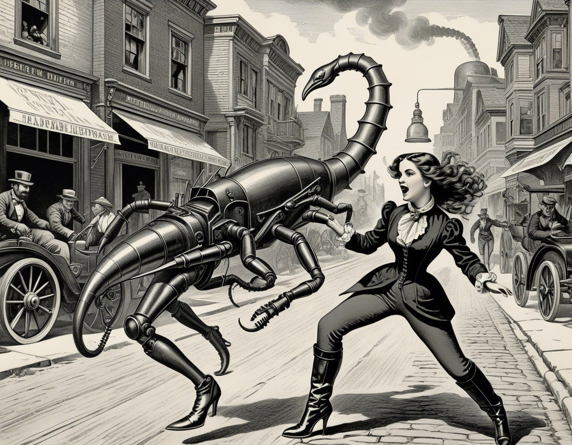 In a vintage street scene, a woman in a stylish outfit confronts a mechanical scorpion, blending steampunk aesthetics with a sense of adventure amidst bystanders and historic architecture.