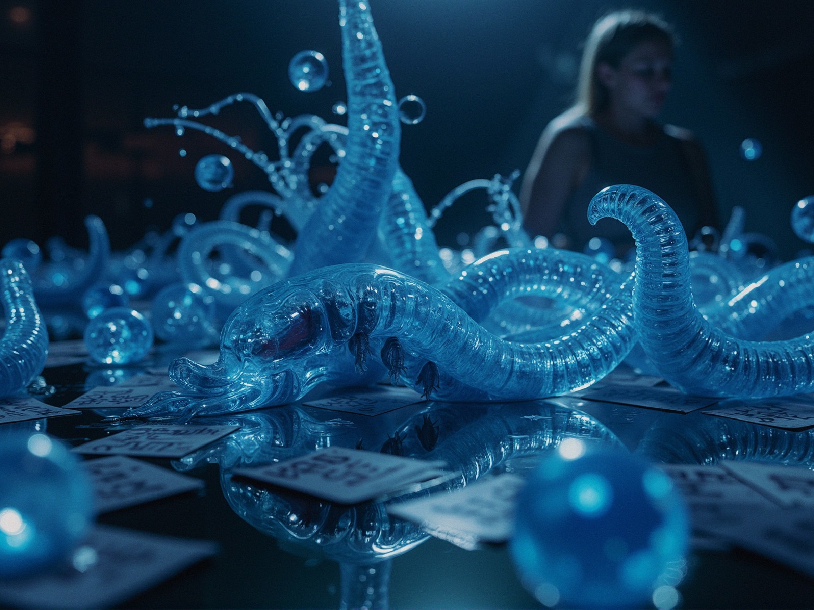 The image features transparent, swirling sculptures resembling creatures, surrounded by floating blue spheres and scattered cards, all set in a dimly lit environment. A figure is blurred in the background.