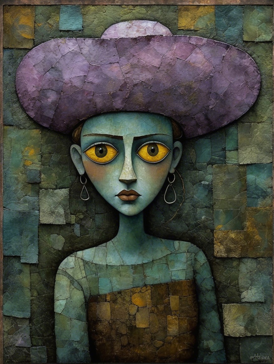 Calamity Jane, Patchwork nostalgia, portrait in ochre, patina of ancient stone with moss, art brut, moody, somber, desaturated colors, in the style of Paul Klee, Arthur Rackham Dark and moody oil painting of a woman with piercing black eyes, inspired by the works of John Singer Sargent and Edgar Degas, long shot, realistic texture, dramatic lighting, intricate details on clothing and jewelry.