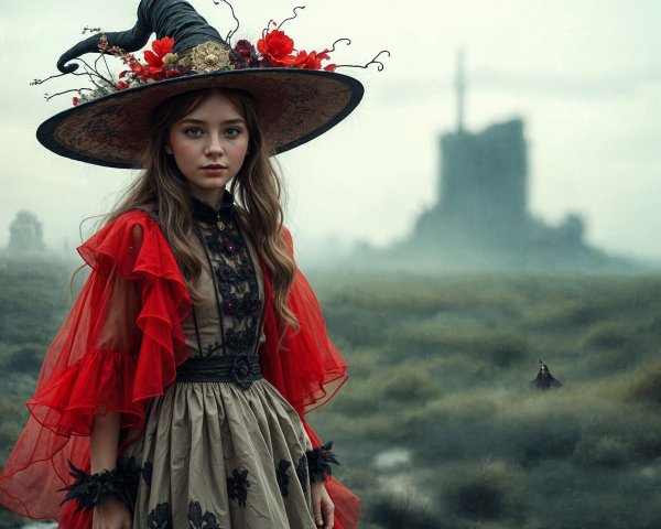 A young girl in a dramatic witch hat adorned with red flowers and feathers, wearing an elegant orange dress. The moody background hints at a mystical, twilight atmosphere.