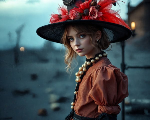 Prompt: young girl in desolate landscape,dramatic black hat with feathers and roses,long flowing hair,vintage rust-colored dress with puffed sleeves,striking large bead necklace,twilight setting with muted colors,abandoned structure in background;soft diffused light,highly detailed,8k resolution,mysterious atmosphere,artstation trending