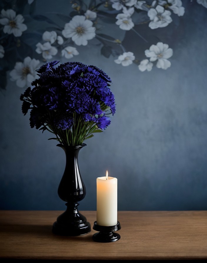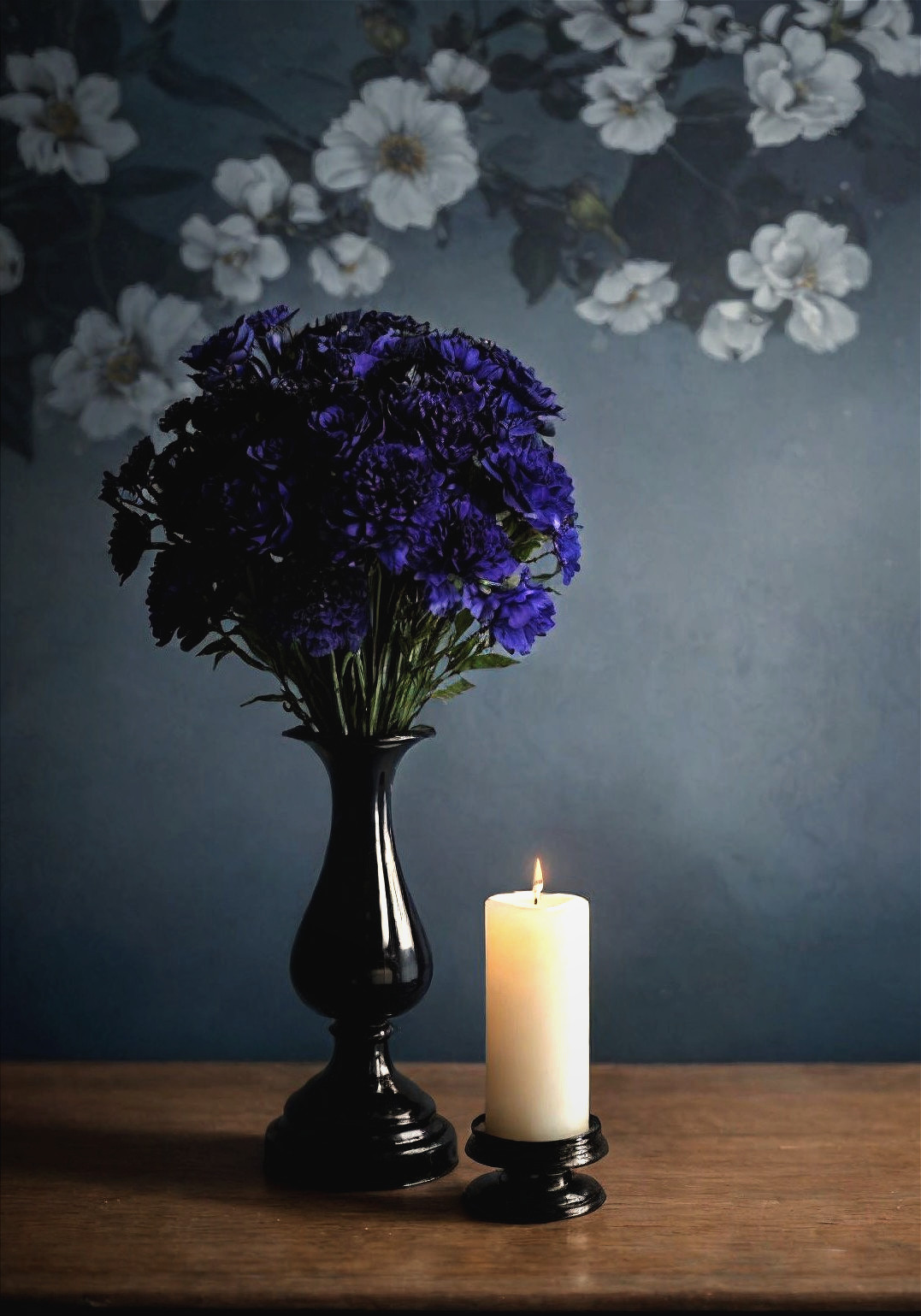 A still life image featuring a bouquet of blue roses in a black vase beside a lit white candle, against a floral backdrop.