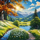 A vibrant landscape featuring a serene lake reflecting majestic mountains. Lush green fields with daisies and orange trees frame the scene under a bright sun and blue sky.