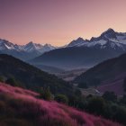 A stunning landscape at dusk, featuring majestic snow-capped mountains under a gradient sky. Vibrant pink wildflowers blanket the foreground, contrasting with the lush green hills below.