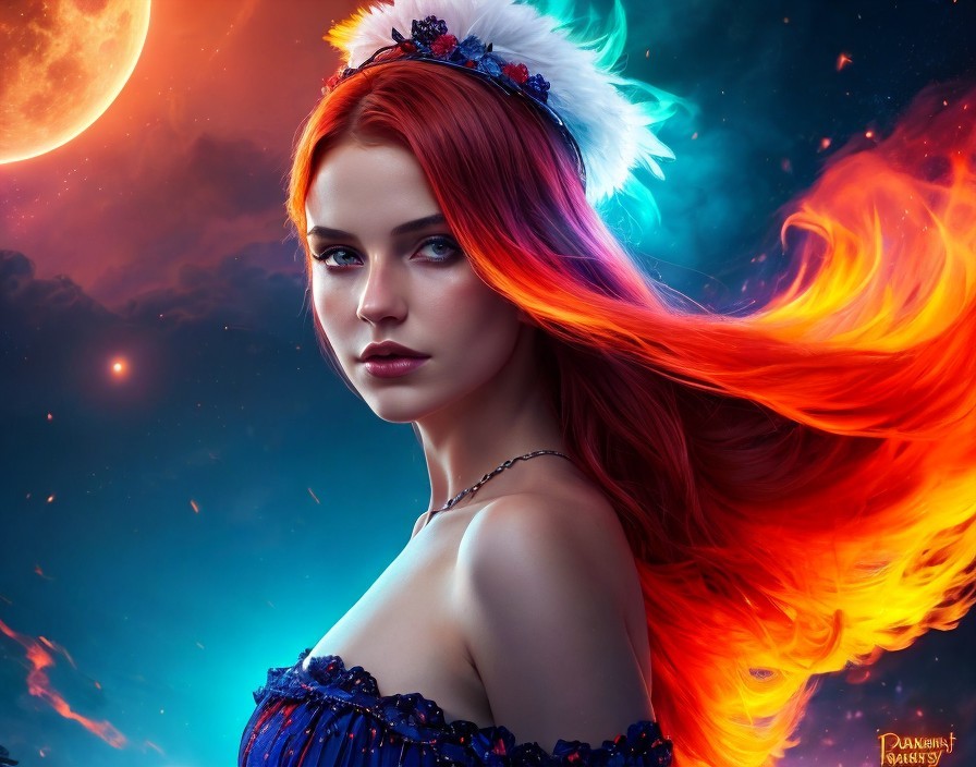 Eine Junge Frau die um ein Feuer tanzt. Sie hat Feuerrotes haare und trägt ein schönes Blaues Kleid.
