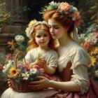 A mother and daughter share a joyful moment in a blooming meadow, both adorned with floral crowns. The daughter smiles brightly, holding a basket of vibrant sunflowers, radiating happiness.