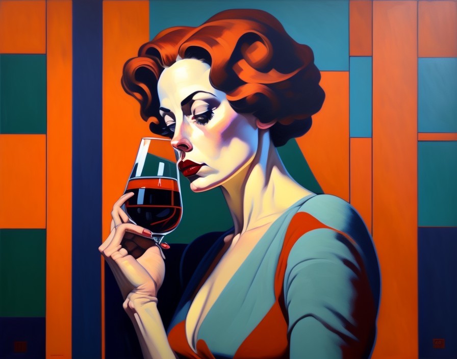 A stylized illustration of a woman with red hair holding a wine glass, set against a colorful background with swirling patterns.