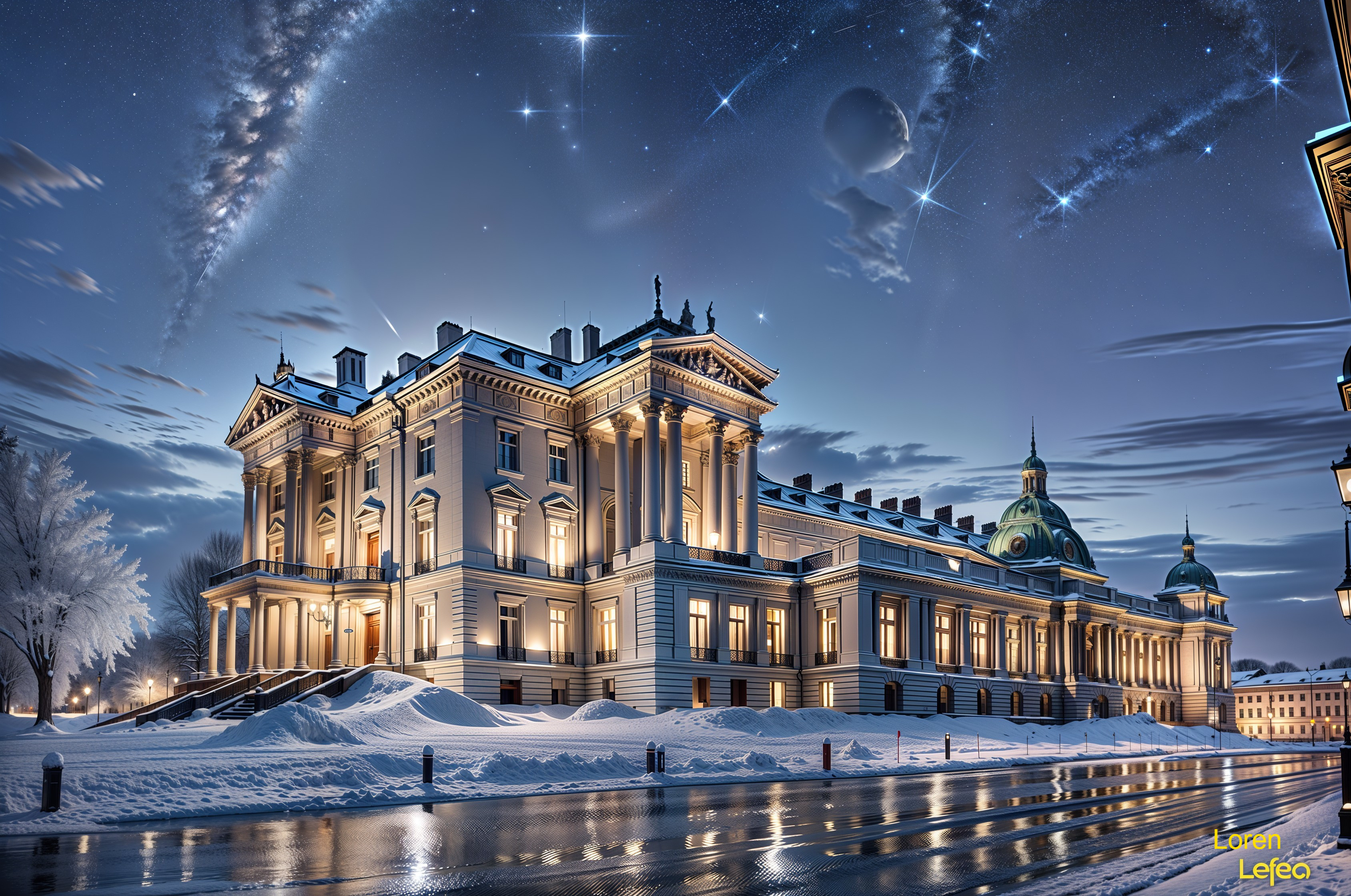 A majestic neoclassical building at night under a starry sky with a glimpse of an aurora and a celestial body visible above.