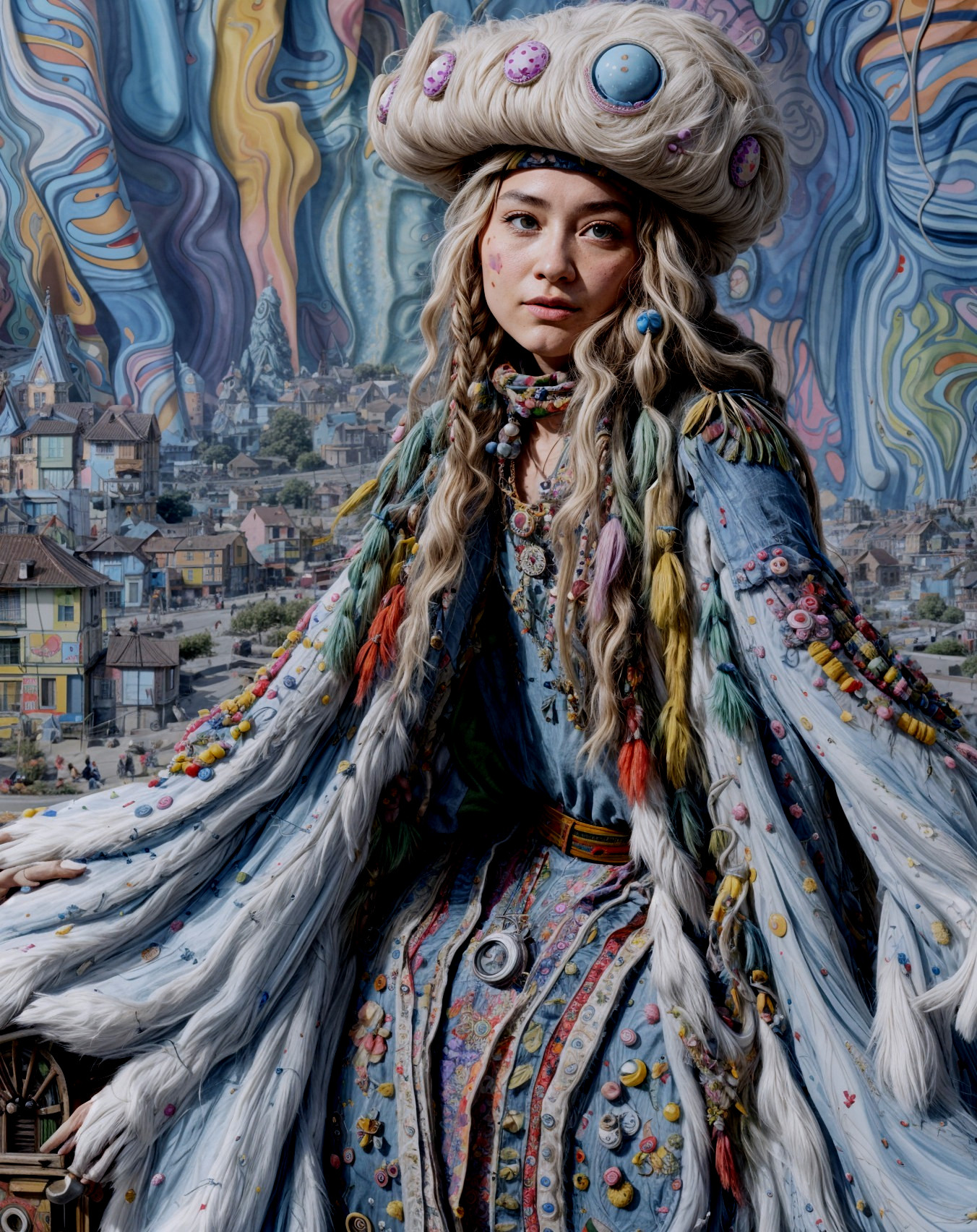 A woman in a colorful, intricately designed outfit adorned with embellishments and a large, textured headpiece, set against a vibrant, swirling background and a detailed village scene.