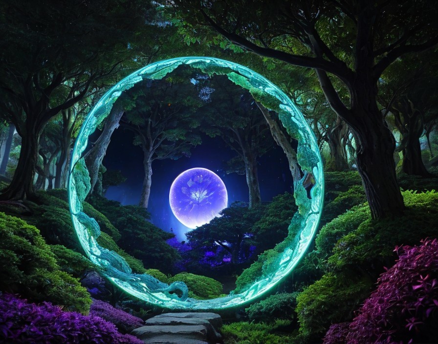 Prompt: "an alien forest world with bonsai trees and sacred extraterrestrial palace. In the center of the scene, there is an intricate and mesmerizing wormhole/portal, swirling and glowing with energy. Through the portal, glimpses of strange and enigmatic DMT entities can be seen. These entities are composed of intricate patterns and radiant hues and seem to emanate a curious wisdom. Surrounding the portal, the surreal landscape is filled with floating celestial bodies, sacred geometry, and shimmering particles that hint at the mystical nature of this cosmic realm"