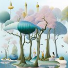 A surreal landscape features whimsical trees and twisting architecture, bathed in soft pastel colors. Ethereal figures in flowing garments navigate a dreamlike world adorned with sparkling orbs.