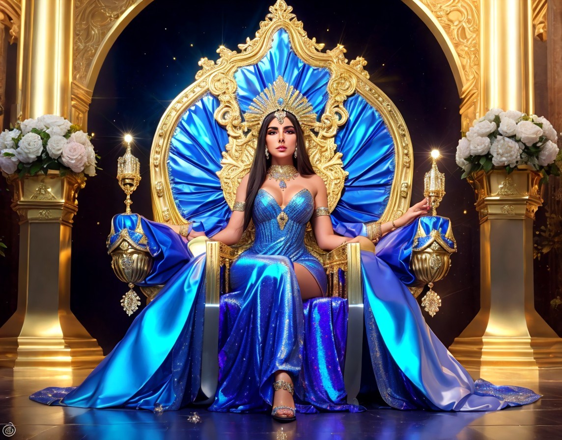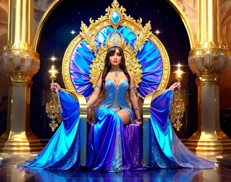 Prompt: Una Diosa muy atractiva recostada sobre un trono plateado y dorado, tacones transparentes, falda corta escote, múltiples joyas, hermoso rostro, ojos azules, pelo rubio, paisaje sobrenatural. cuerpo completo