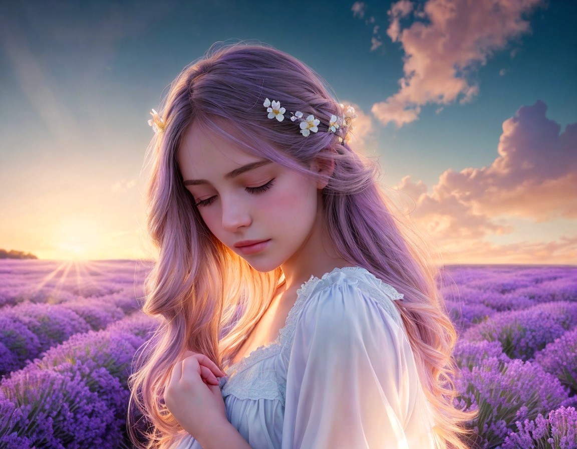 Prompt: "Soft lavender field, blooming flowers, gentle breeze, serene atmosphere, peaceful setting, young girl sleeping peacefully, flowing long hair, delicate features, ethereal beauty, pastel colors, dreamlike quality, tranquil scene, natural lighting, sunset glow, artistically rendered, detailed illustration, emotional connection, fantasy touch, calming vibes."