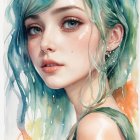 A young girl with braided hair and green eyes sits by the beach, wearing a colorful hoodie. The watercolor background features soft sunset hues, evoking a serene, summer vibe.