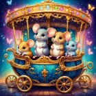 A whimsical scene featuring adorable kittens adorned with jewels, riding in a sparkling, ornate carriage under a starry night sky, surrounded by colorful butterflies and blooming roses.