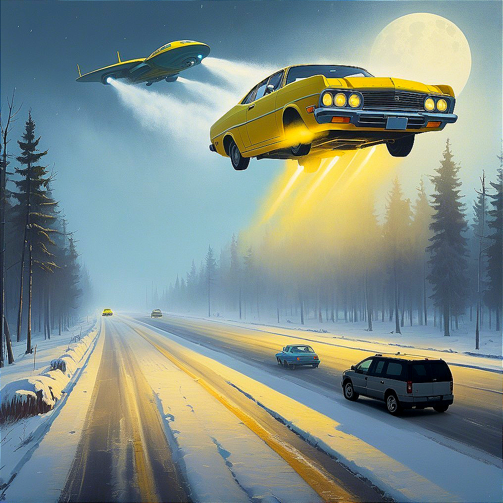 A yellow flying car soars above a snowy road with a retro-futuristic aircraft in the sky, amidst a serene forest setting at dusk.
