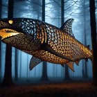 A large, ornate fish with intricate patterns floats among dark trees in a misty forest. Its scales glow softly, contrasting the eerie, shadowy surroundings, creating a surreal atmosphere.