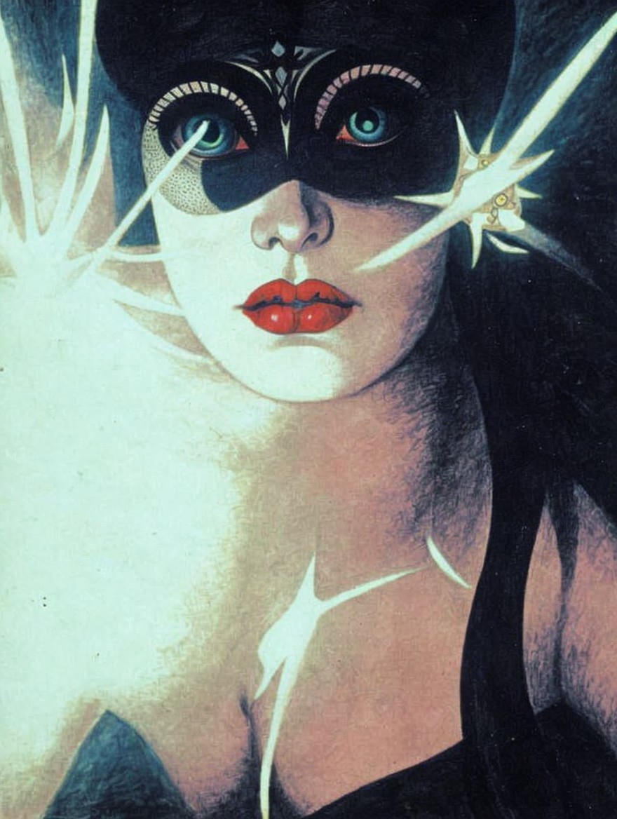 A stylized painting of a woman with a masquerade mask, striking red lips, and decorative patterns on her hands and forehead.