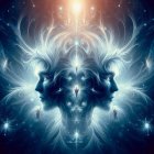 The image features two ethereal figures with glowing, flowing hair, set against a vibrant, colorful background. Their mirrored expressions convey a sense of connection and mystique.