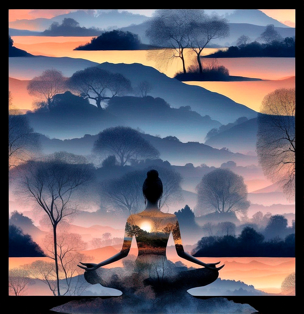 A serene composite image blending a woman in meditation with a tranquil landscape during sunset, creating a peaceful, introspective mood.