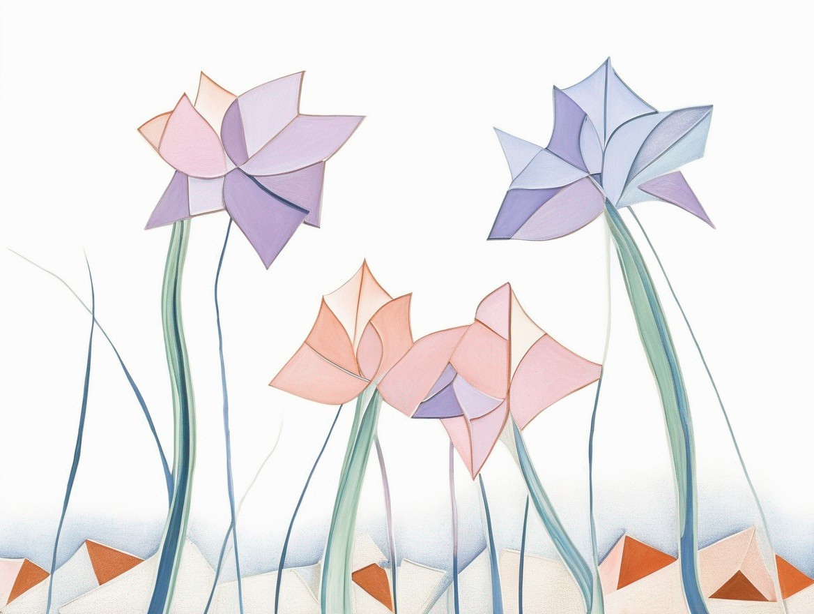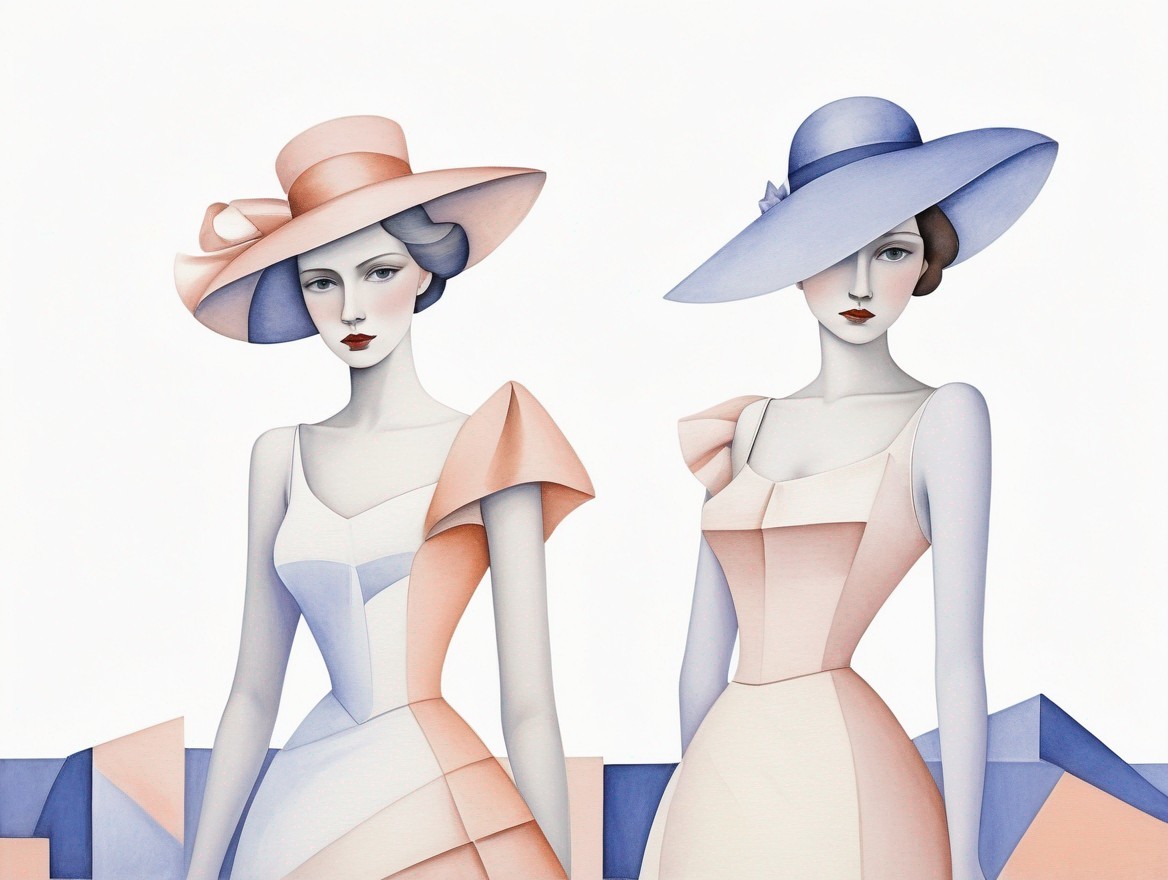 Two stylized women in pastel dresses and large hats with an abstract, geometric background.