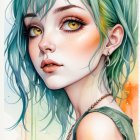 A stunning watercolor portrait of a young woman with vibrant, flowing teal hair. Her expressive blue eyes and softly featured face radiate a dreamy, ethereal quality. Background colors blend beautifully.