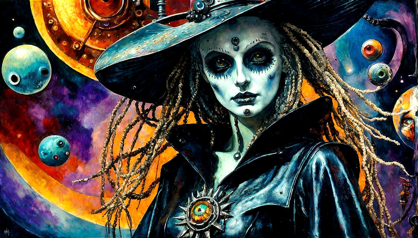 A vivid artwork of a witch with celestial bodies in the background, featuring striking makeup and a mystical eye ornament.
