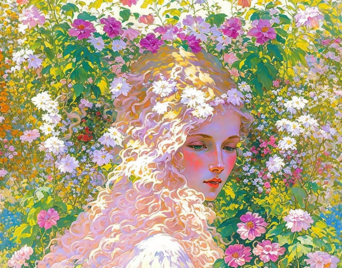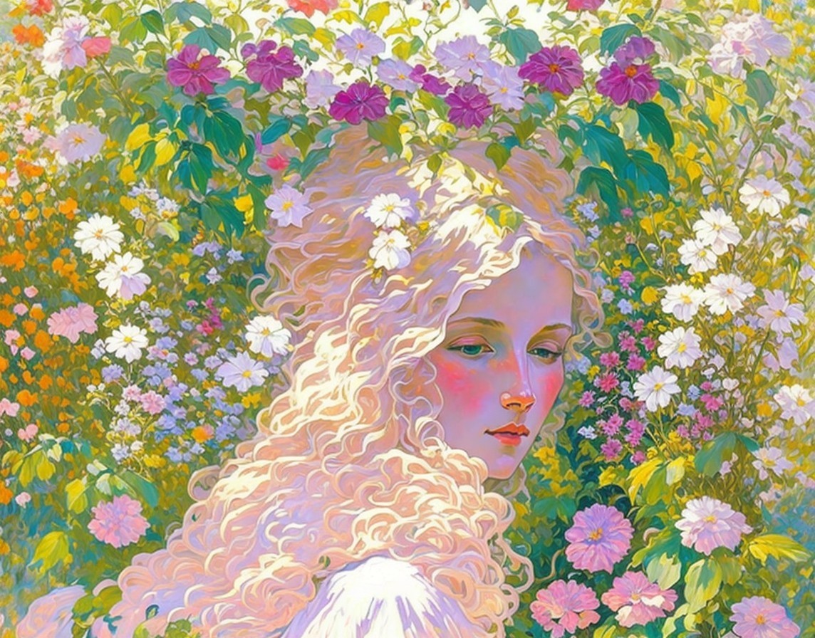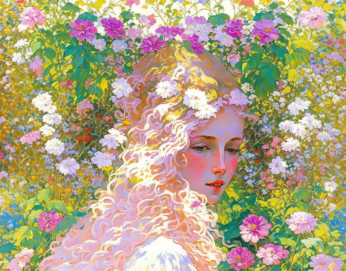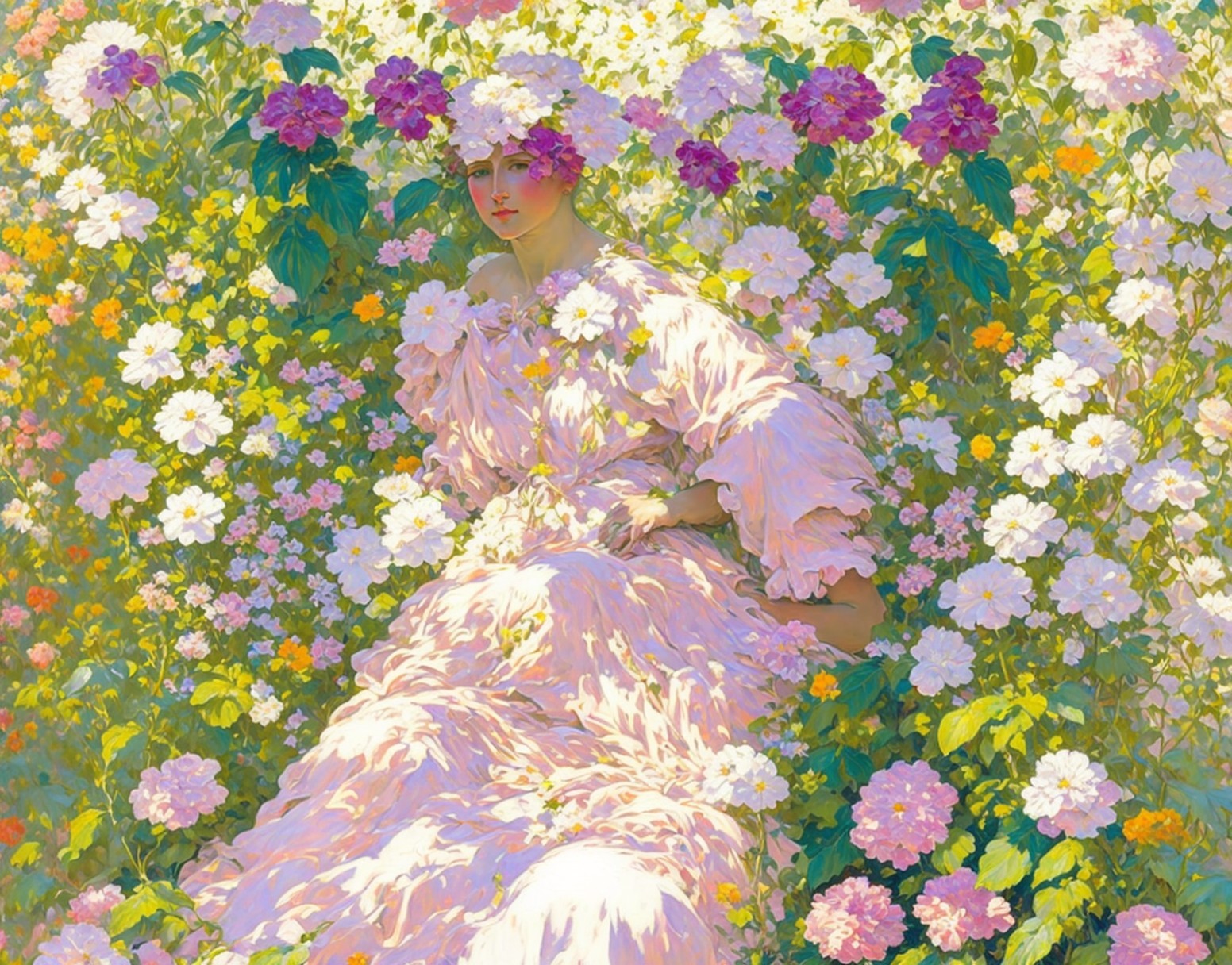 Woman in light dress surrounded by vibrant flowers and dappled sunlight