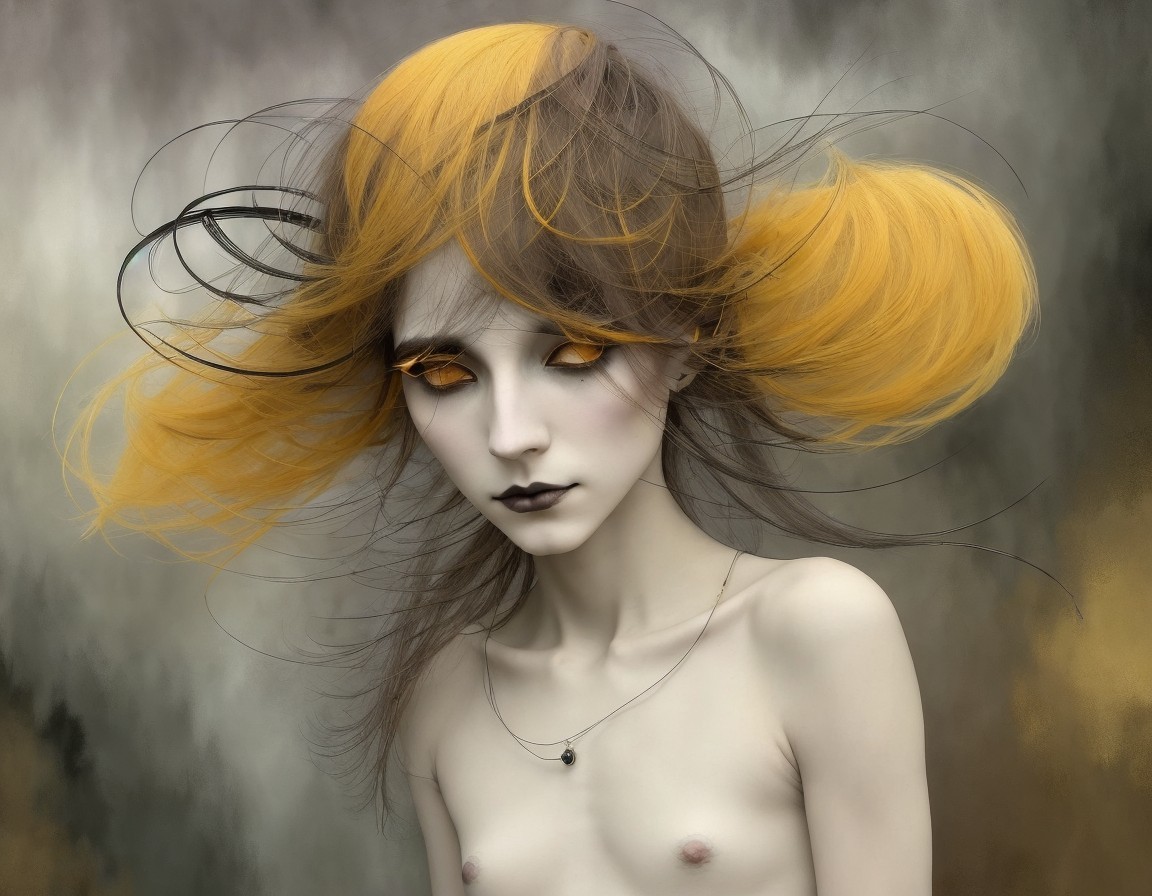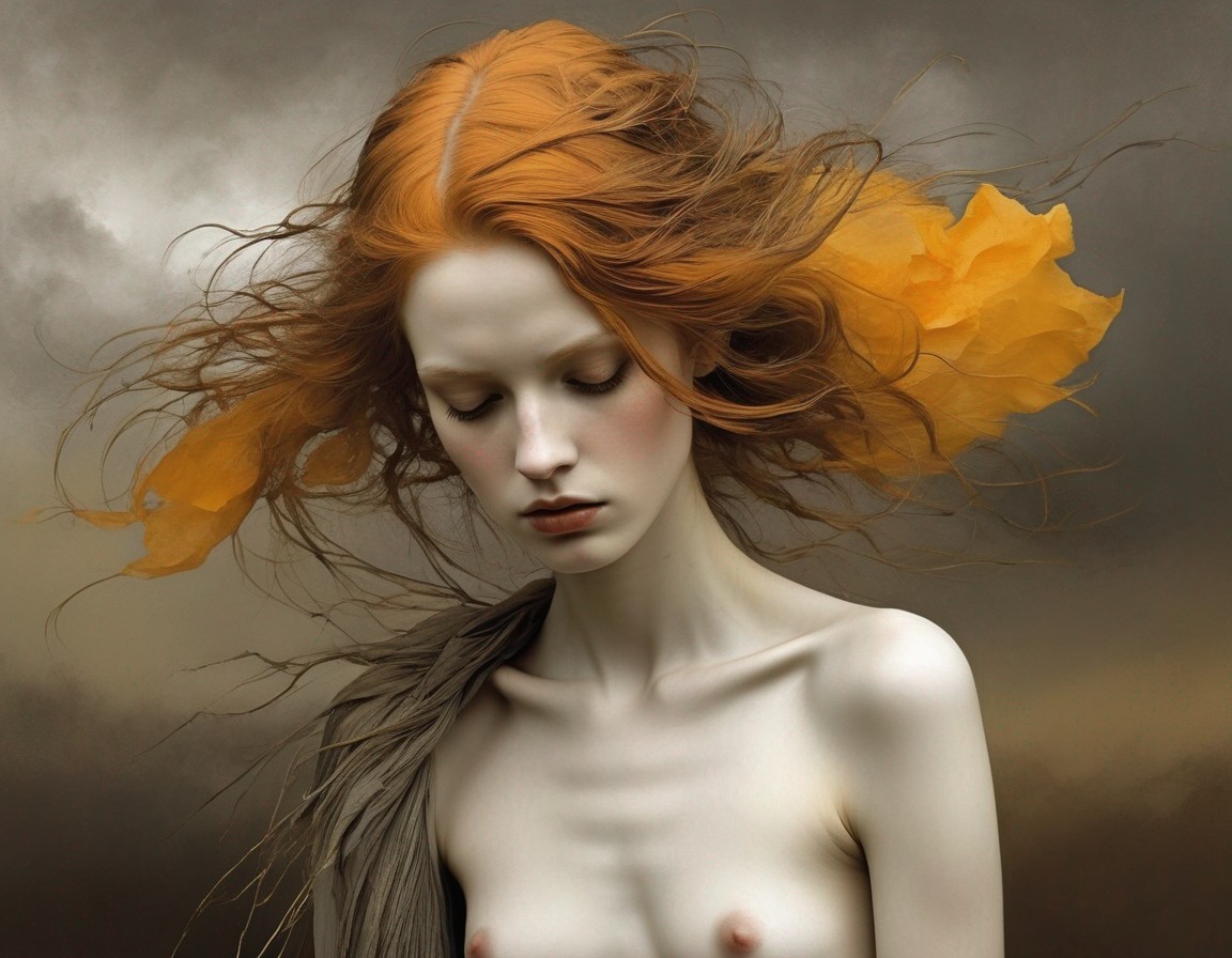 A woman with red hair and a gold dress, adorned with a large orange flower, closes her eyes against an abstract backdrop.