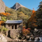 A rustic wooden cabin sits by a tranquil stream surrounded by colorful autumn foliage, with a majestic mountain towering in the background under a clear blue sky.