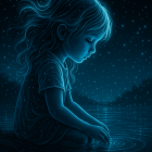 A serene, luminescent scene depicts a young girl with flowing hair, sitting by a starry water surface. She gazes thoughtfully at the gentle ripples, surrounded by a tranquil night sky.