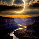 A stunning landscape featuring a deep canyon and a tranquil lake, illuminated by a radiant sunrise. The sky is vibrant with a celestial object, adding an otherworldly glow to the scene.
