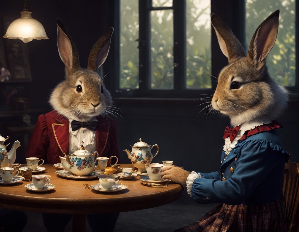 A woman and a humanoid rabbit in formal attire sit at a table set with an elegant tea set, conveying a whimsical, surreal atmosphere.
